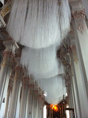 Those white things hanging on the ceiling are a bunch of strings. From what I've read, the artist uses a combination of lights and sounds to simulate clouds, and it's supposedly very pretty.